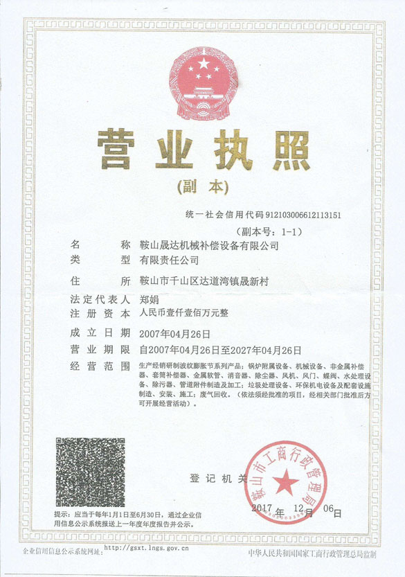 鞍山晟達(dá)機(jī)械補(bǔ)償設(shè)備有限公司成立于2007年4月,是生產(chǎn)、經(jīng)銷、研制波紋膨脹節(jié)系列產(chǎn)品,非金屬補(bǔ)償器,套筒補(bǔ)償器,橡膠接頭,電動(dòng)擋板閥,卸灰閥,蝶閥,消音器,刮板機(jī),除塵設(shè)備等環(huán)保類設(shè)備的專業(yè)生產(chǎn)廠家。